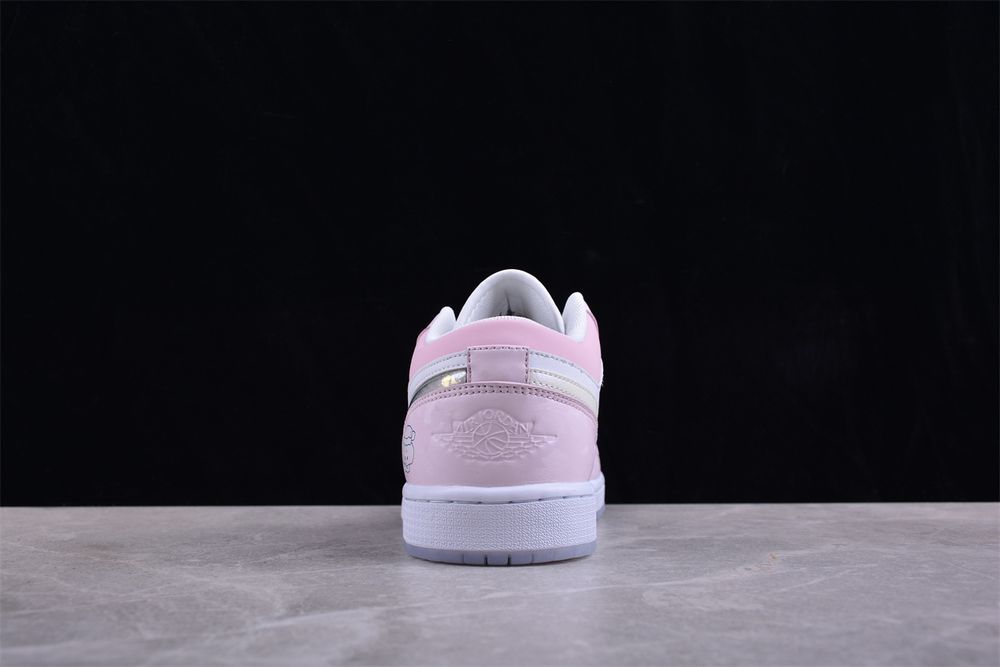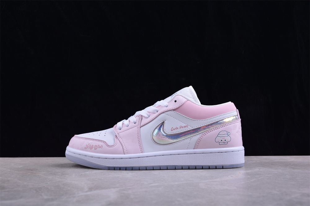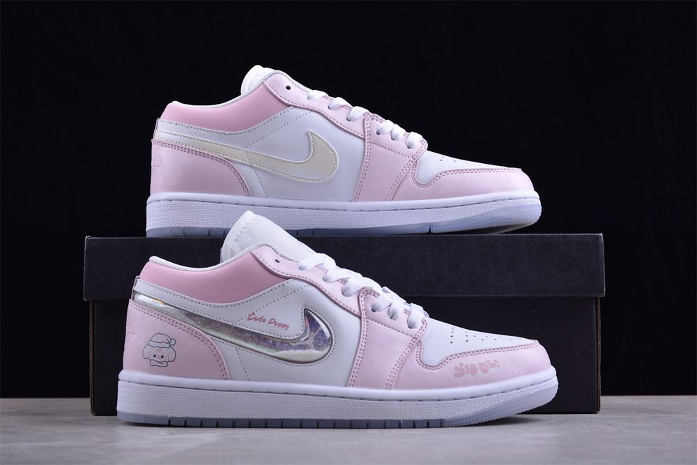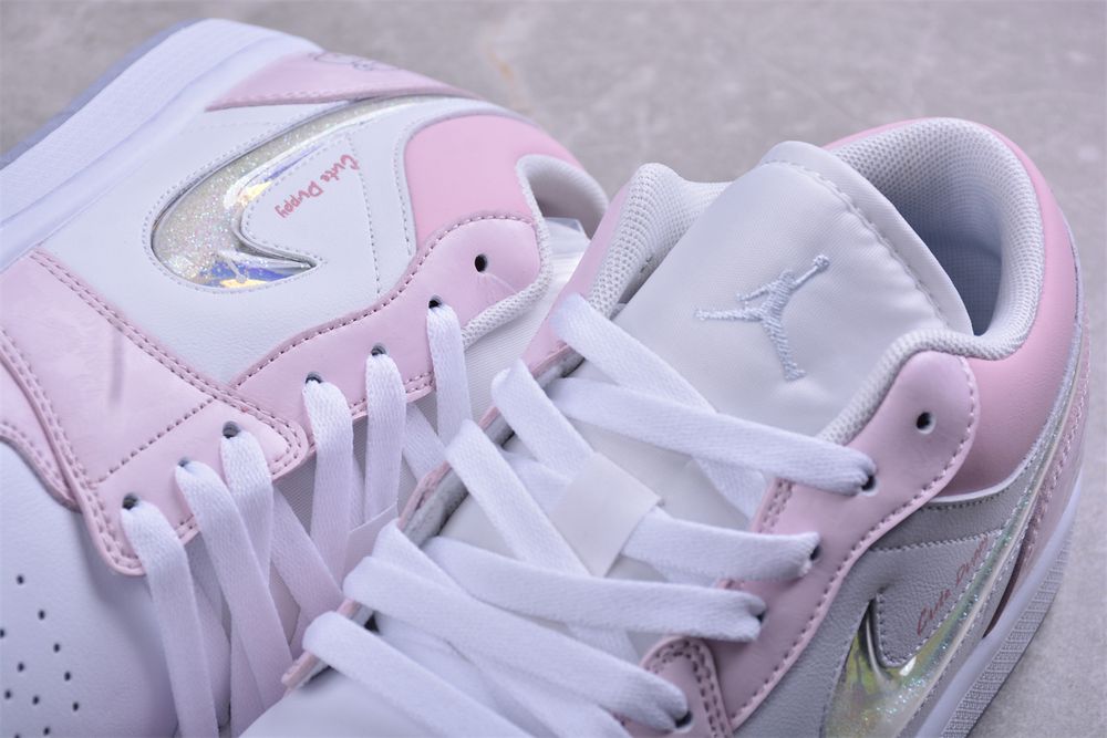 The highlight remains the shimmering Glitter Swoosh, adding subtle sparkle and dimension along the side panels. Custom pink graphic accents enhance the playful aesthetic, giving the pair a unique personality while maintaining the classic AJ1 Low structure.