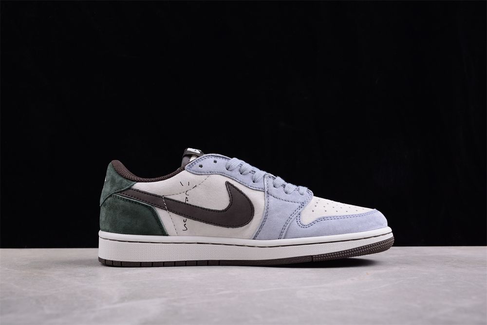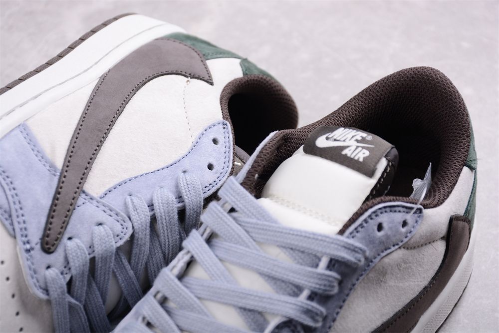 The AJ 1 Low Travis Scott DM7866-820 showcases La Flame’s iconic design language through a refined mix of premium materials and muted color blocking. Soft suede overlays in cool grey complement a creamy base, while deep olive accents at the heel add natural contrast and depth.