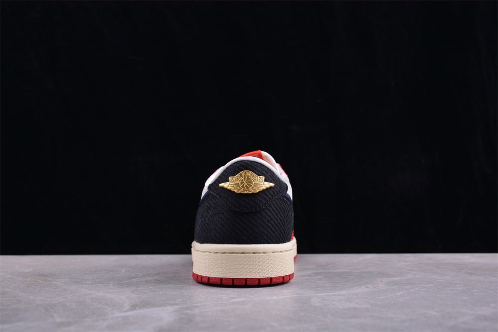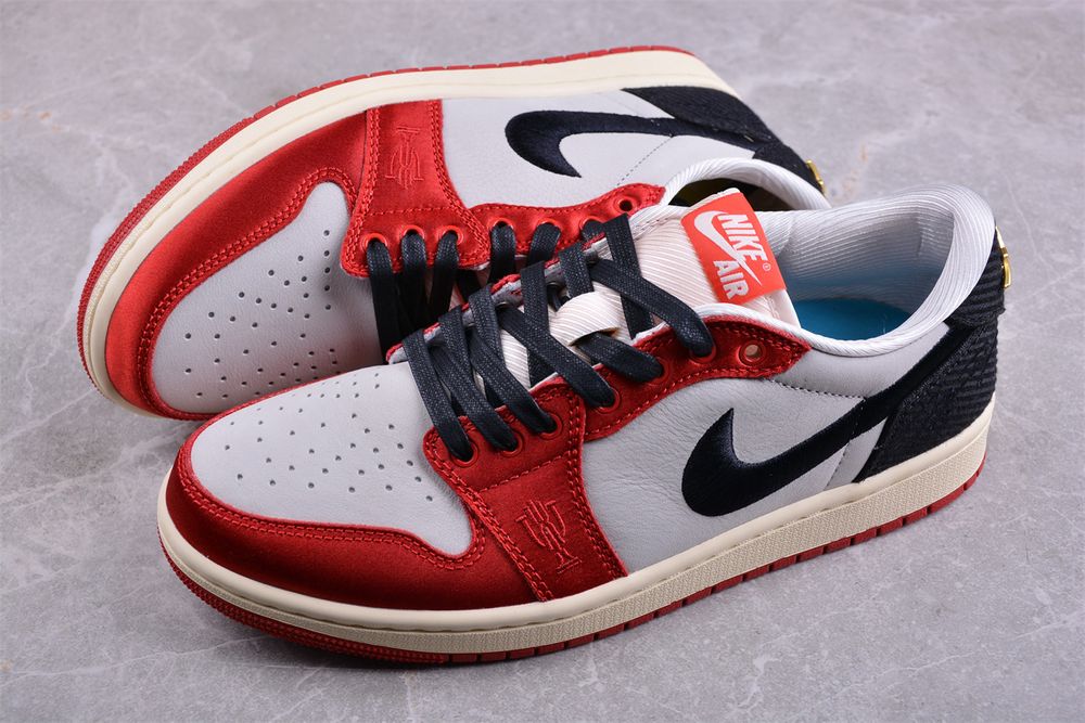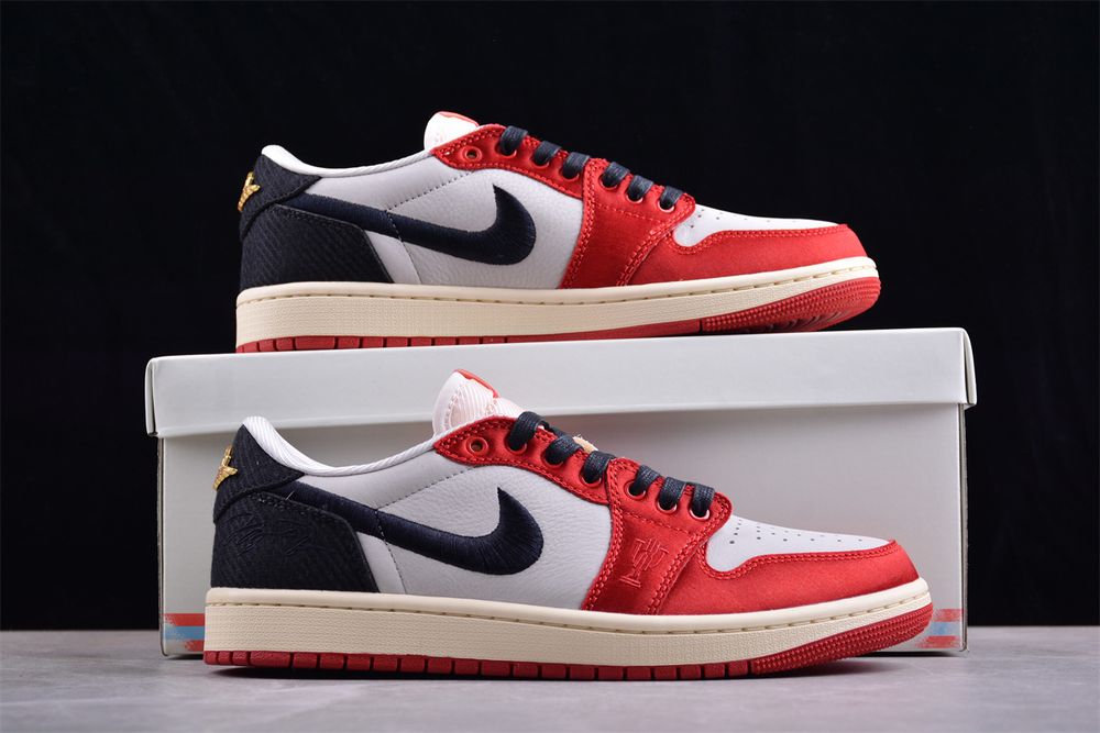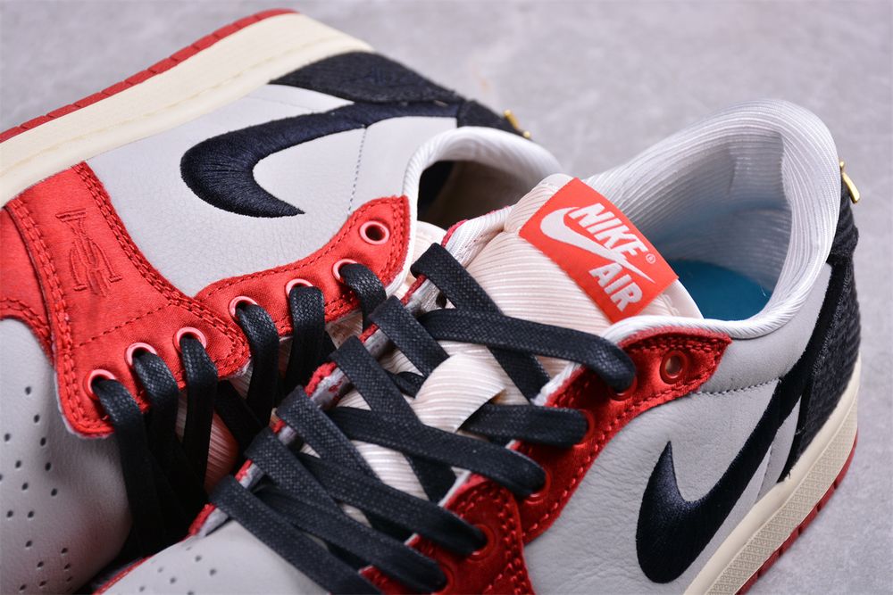 Underfoot, a vintage off-white midsole enhances the retro aesthetic, paired with a crimson rubber outsole for durable traction. Blending heritage inspiration with elevated detailing, AJ 1 Low Trophy Room 'Away' FN0432-100 stands as a modern tribute to an enduring icon.