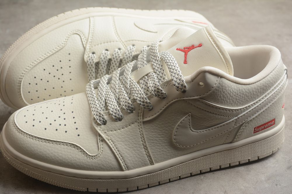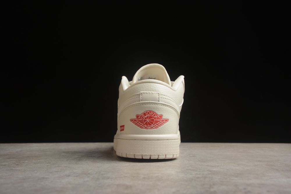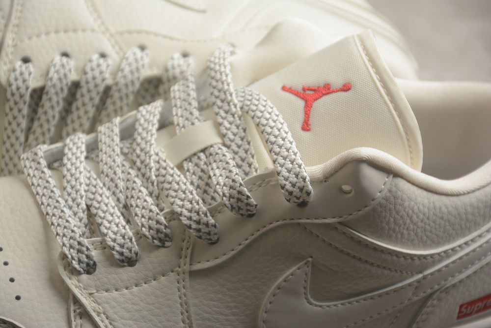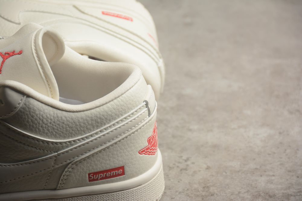 Minimal tones meet bold street heritage — the AJ 1 Low x Supreme WG8850-002 delivers clean luxury with unmistakable red branding accents.