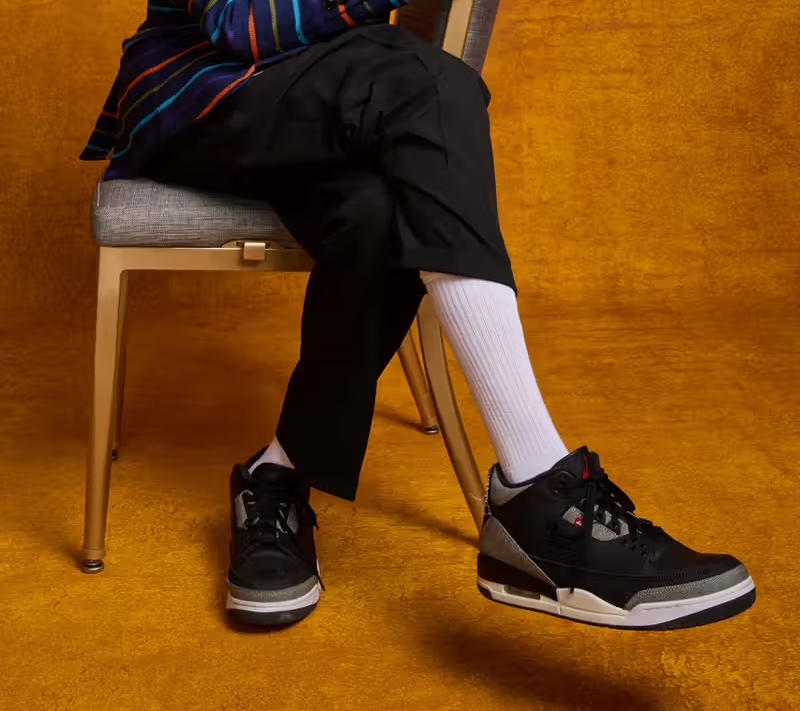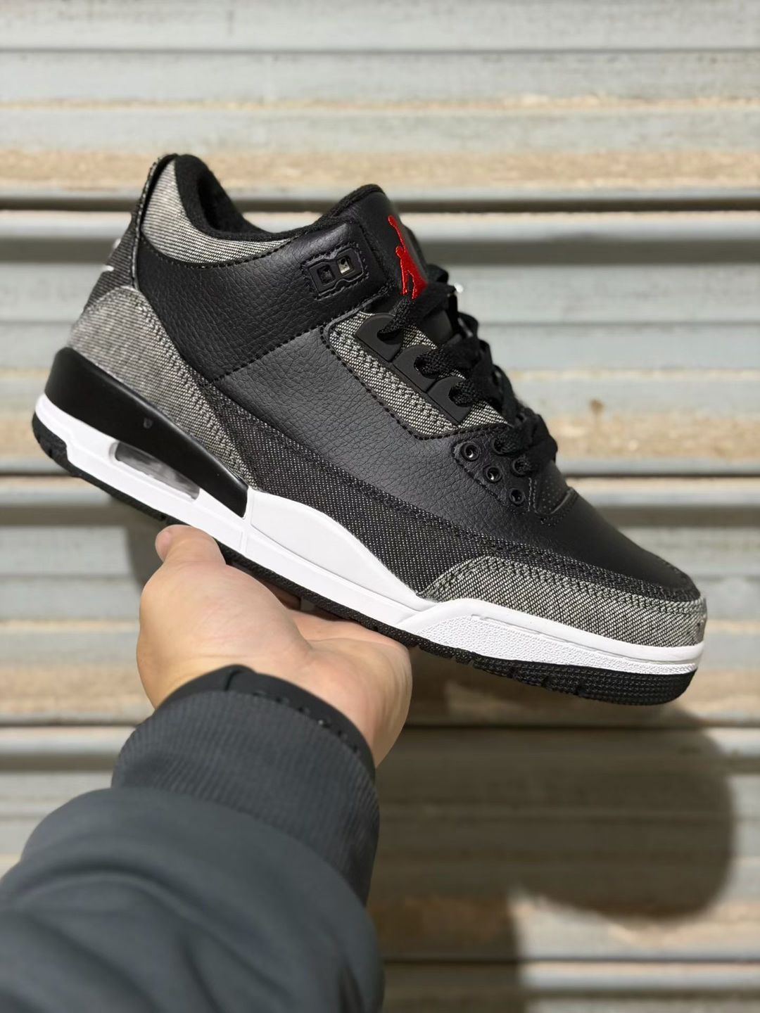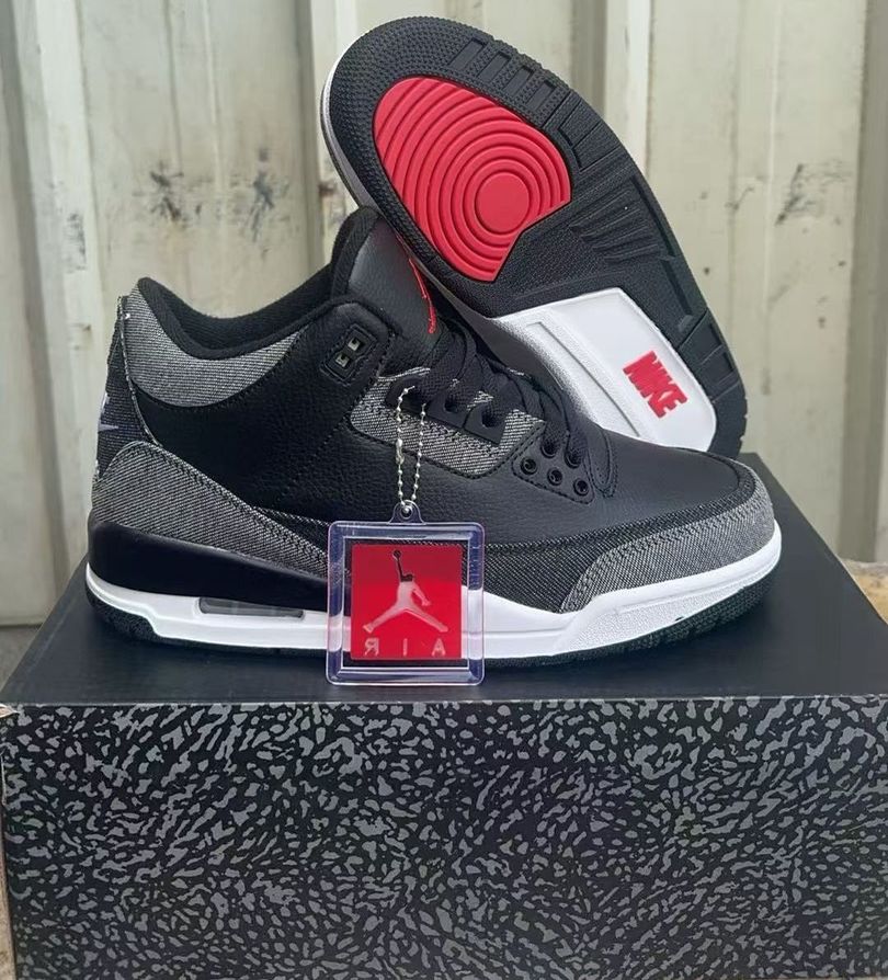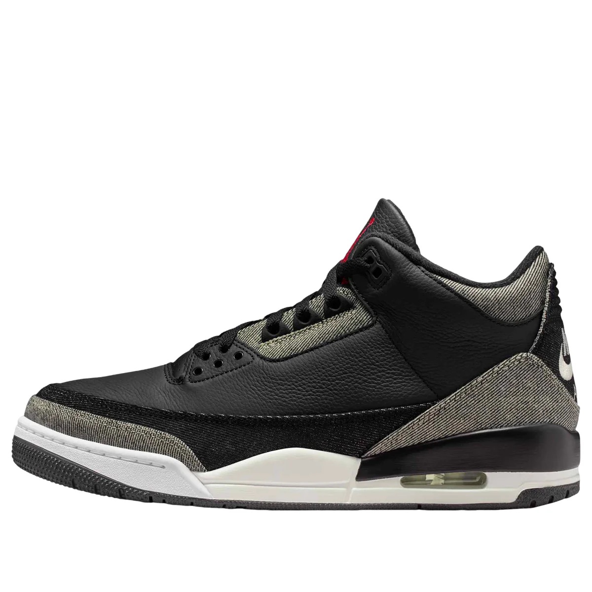 The upper features a base of tumbled black leather, providing a clean and structured foundation inspired by the iconic Black Cement 3. Replacing the traditional elephant print overlays, multi-wash denim panels wrap the toe, heel, and midfoot, introducing a rugged, worn-in aesthetic that sets this pair apart from standard releases.