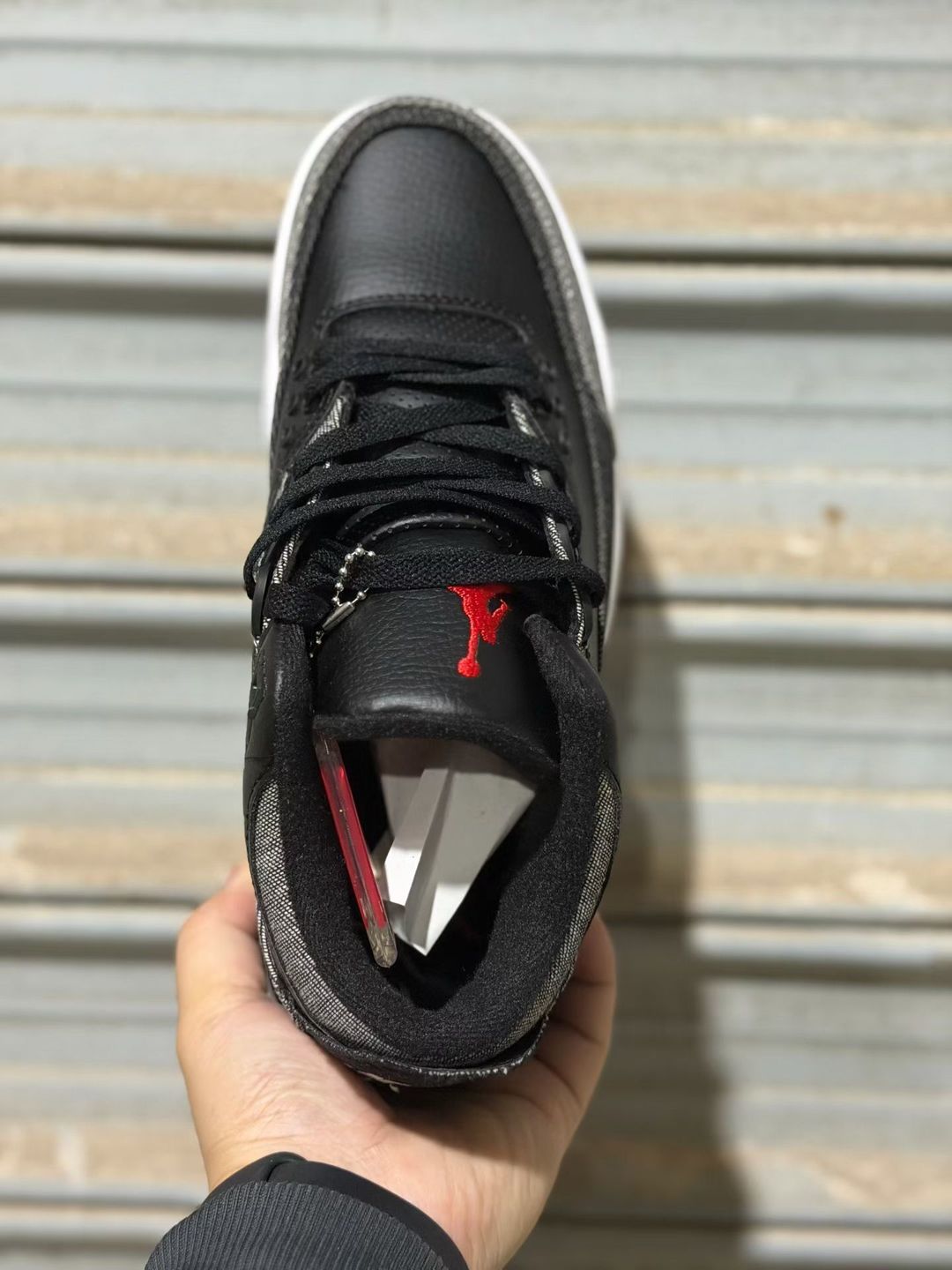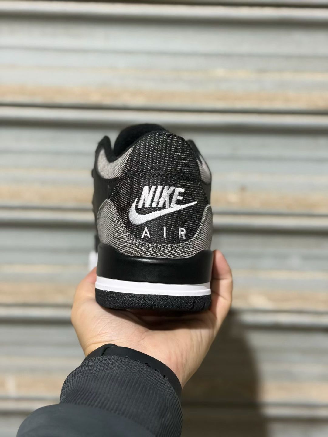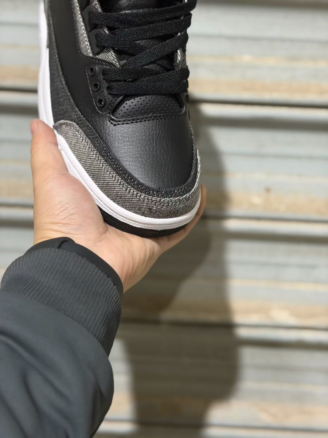 The upper features a base of tumbled black leather, providing a clean and structured foundation inspired by the iconic Black Cement 3. Replacing the traditional elephant print overlays, multi-wash denim panels wrap the toe, heel, and midfoot, introducing a rugged, worn-in aesthetic that sets this pair apart from standard releases.